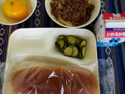 10月12日(火)の給食は、タンタンめん・きゅうりの甘酢づけ・みかん・黒糖パン・牛乳です。