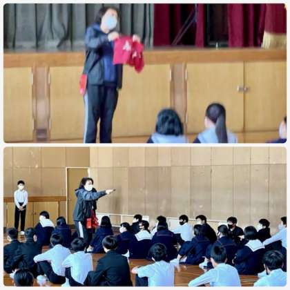 今朝は、2年生が体育館で学年集会を行いました。山本先生のお話です。名前についてお話しくださいました。皆さん一人一人に素敵な名前があります。思いや願いを込めてつけていただいた名前を大切にしましょう。