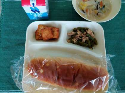 10月21日(木)の給食は、はくさいのクリーム煮・あつあげのごまじょうゆかけ・豚肉とさんどまめのオイスターソースいため・おさつパン・牛乳です。