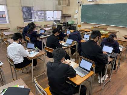 1年生は、少人数授業で英語の学習をしています。一人一台学習者用端末(ひとり1台P.C.)が活用されています。