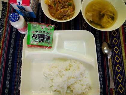 10月25日(月)の給食は、ピリ辛丼・中華スープ・ソフト黒豆・発酵乳(中)・ご飯・牛乳です。
