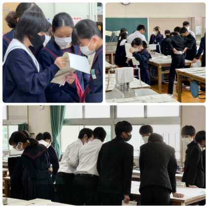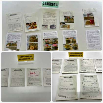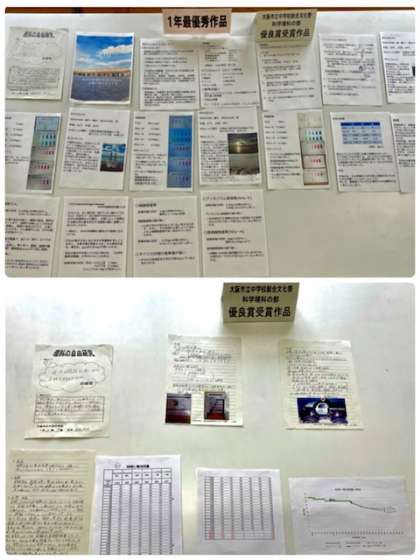1・2年生理科の自由研究が展示されています。見事な研究に保護者の方からお言葉をいただきました。