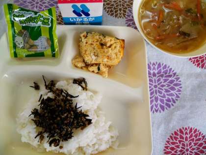 11月4日(木)の給食は、千草焼き・みそ汁・ごまひじき・まっ茶大豆・ご飯・牛乳です。