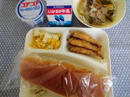 11月5日(金)の給食は、わかさぎフライ・スープ・カリフラワーとコーンのサラダ・ヨーグルト・バター・大コッペパン・牛乳です。