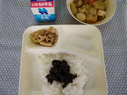 11月8日(月)の給食は、関東煮・れんこんの梅風味焼き・のりのつくだ煮・ご飯・牛乳です。