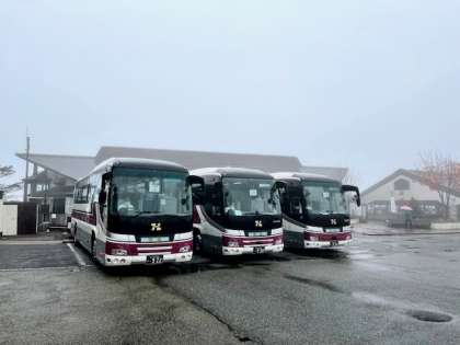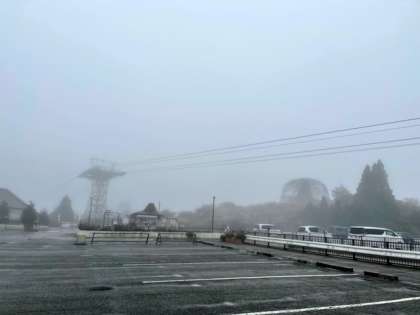 修学旅行のバスは、六甲山頂のガーデンテラスに到着しました。あいにく霧のような小雨が降ってきました。