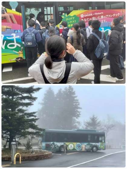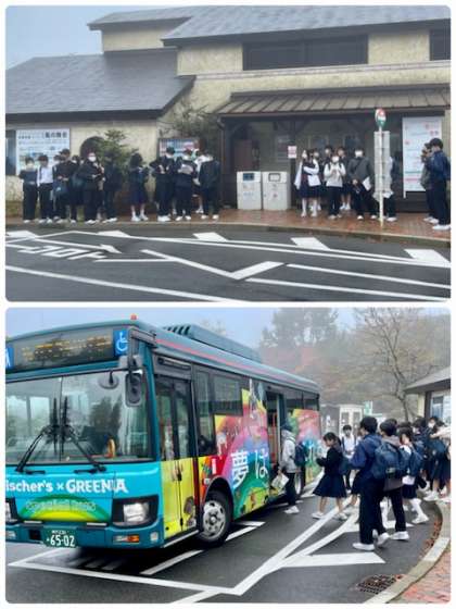 1組の生徒たちが、ガーデンテラスから森の音ミュージアムへ、ROKKO 山上バスに移動です。