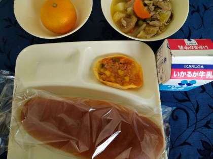 11月10日(水)の給食は、豚肉と野菜のスープ煮・変わりピザ・みかん・黒糖パン・牛乳です。