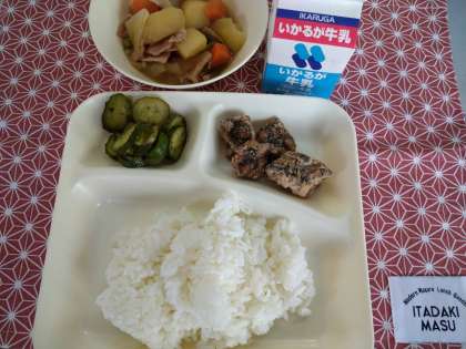 11月11日(木)の給食は、くじらのたつたあげ・豚肉とじゃがいもの煮もの・きゅうりの赤じそあえ・ご飯・牛乳です。