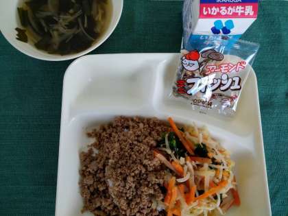 11月15日(月)の給食は、ビビンバ・わかめスープ・アーモンドフィッシュ・ご飯・牛乳です。