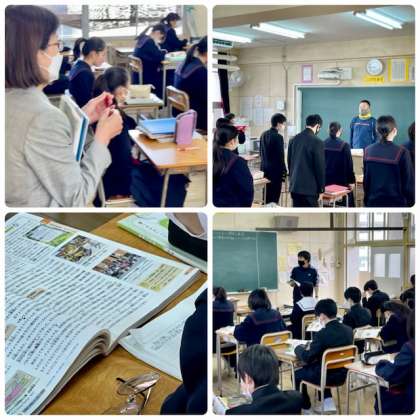 今朝の1年生学習の様子です。1組は社会、2組は数学、3組は英語の学習です。2組は松田先生数学の研究授業です。大阪市教育センターから学力向上支援員の石川邦子先生にご指導いただきます。3組は2グループに分けて習熟度別少人数等を行なっています。ラジカセから流れるネイティブイングリッシュを聞き取り、dictation(書き取り)テストを行っていました。スラスラと聞き取って英文を書いている様子に感心しました。