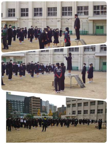 また、先週の全校集会で人権週間のことを話しましたが、この人権週間に合わせて、違いを認め合い、自分の事や相手の事を大切にする大淀中学校にしていきましょう。12月は挨拶をしっかりしましょう。挨拶はお互いを理解できる第1のステップです。
