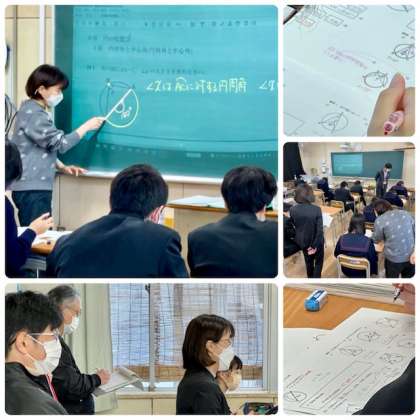 3年1組 数学の学習です。今日は「円の性質」の研究授業です。大阪市教育センターから学力向上支援員の石川邦子先生にお越しいただき参観とご指導をいただきました。円周角、中心角の関係を演習問題を通して学んでいます。補助線を加えたり、弧と角の性質を理解しながら学習を進めています。習熟度別少人数での指導に加えて、参観いただいた先生方の個別指導が理解を深めています。