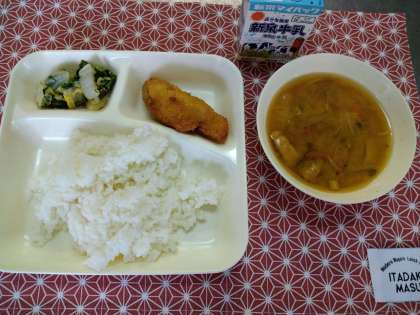 12月10日(金)の給食は、たらフライ・さつまいものみそ汁・きくなとはくさいのごまあえ・ご飯・牛乳です。