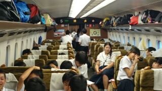 博多駅で停車中です。生徒は元気いっぱいです。もうすぐ家から持ってきた弁当を食べる時間になります。