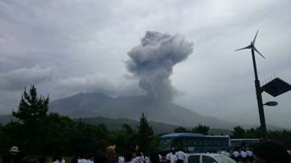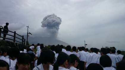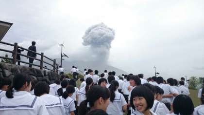赤岩展望所で学年全体写真を撮っているといきなり噴煙が上がりました。