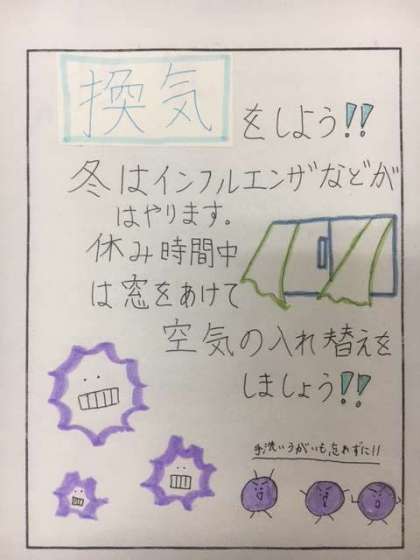 新型コロナウイルス対策として、常に教室内の換気を実施しています。また、休み時間中はさらに窓を全開にしての換気にご協力お願いします。