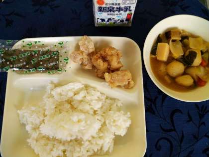 2月4日(金)の給食は、鶏肉のからあげ・まる天と野菜のうま煮・焼きのり・ご飯・牛乳です。