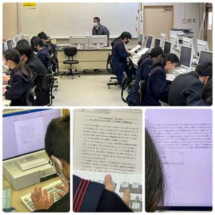 パソコン教室では、文字入力の学習です。ワープロ検定4級の課題にチャレンジしています。1分間で200文字の入力で合格です。クラスの半分以上の生徒が合格基準に達しています。