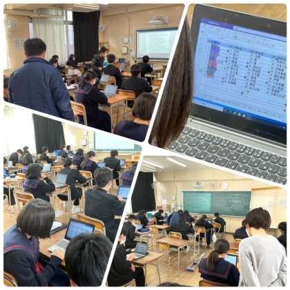 2年生も進路学習です。コロナ禍で職業体験ができなかったので、将来の自己実現に向けてひとり1台パソコンを活用して、将来の職業から大学、高校を連携させた調べ学習をしています。