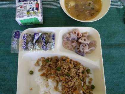 2月28日(月)の給食は、鶏ごぼうご飯・みそ汁・焼きれんこん・きざみのり・ご飯・牛乳です。