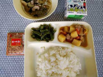 3月2日(水)の給食は、変わり肉じゃが・鶏肉と白菜のすまし汁・さんどまめのごまあえ・ご飯・牛乳です。