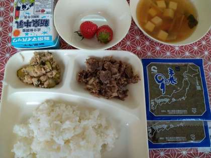 3月4日(金)の給食は、卒業祝い献立です。手巻きご飯(牛肉の甘辛煮、ツナソテー)・すまし汁・いちご・ご飯・牛乳です。