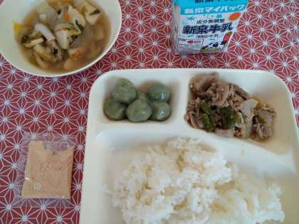 3月8日(火)の給食は、豚肉とれんこんのいため煮・五目汁・きな粉よもぎだんご・ご飯・牛乳です。