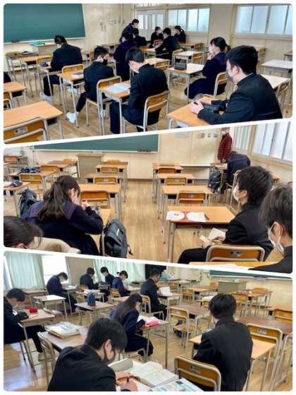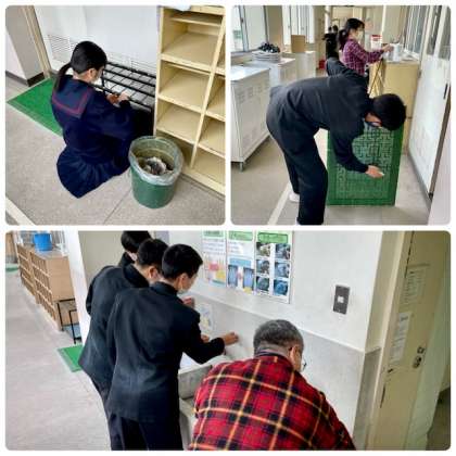 本日3年生は、公立高等学校一般選抜です。私立高等学校等に進路先が決まった生徒は登校して、次の学年に気持ちよく教室を使ってもらうために、教室整備と各自の課題学習をしました。