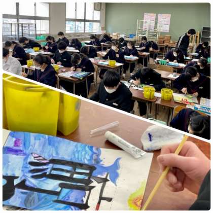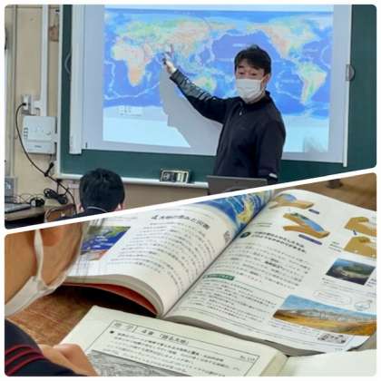 1年生の授業の様子です。1組は数学です。Team Teachingで一人一台端末を活用して学習しています。2組は美術です。各自課題を黙々と描いています。3組は理科です。大久保先生のわかりやすい授業に生徒は興味関心を高めて聞き入っています。