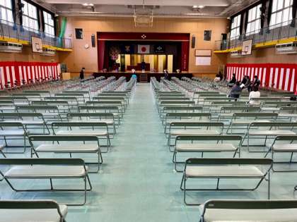 卒業生の登校は9時25分までに完了しましょう。在校生の体育館への入場完了は9時40分です。