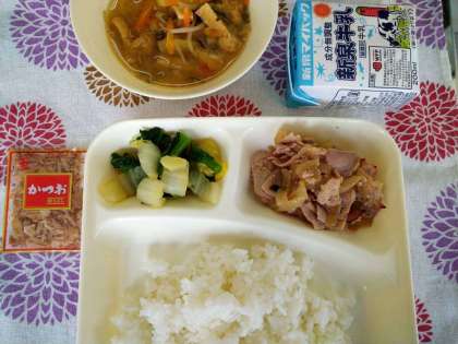 3月15日(火)の給食は、豚肉のしょうが焼き・さつまいものみそ汁・なのはなのおひたし・ご飯・牛乳です。