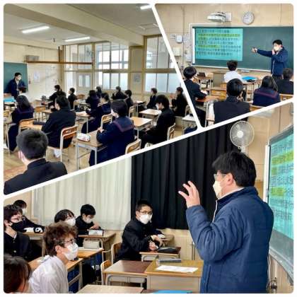 2年生では、キャリア学習で進路指導主事の山田先生が授業をしてくださっています。2年生各学級で事前に知りたい事についてアンケートを実施し、その結果をもとに学習しています。生徒の眼差しは真剣です。