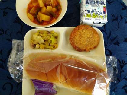 3月16日(水)の給食は、チキンレバーカツ・ケチャップ煮・たことキャベツのバジルソテー・ブルーベリージャム・大コッペパン・牛乳です。