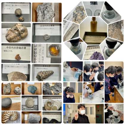 1年理科の授業の様子です。鉱物や化石を双眼鏡で観察したり、大久保先生が収集された本物の鉱物や化石を観察したり学習しました。