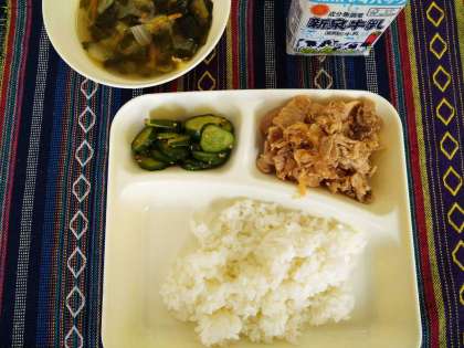 3月17日(木)の給食は、豚肉のコチジャンいため・鶏肉とはるさめのスープ・きゅうりのナムル風・ご飯・牛乳です。