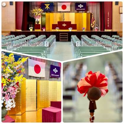 入学式に先立って、午前9時よりグラウンドで学級発表を行います。新入生受付は9時10分から行います。保護者の皆様におかれましては就学通知書をご持参ください。