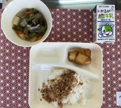 鶏肉とじゃがいもの煮もの、厚揚げのしょうゆがけ、紅サケそぼろ、ご飯、牛乳です。