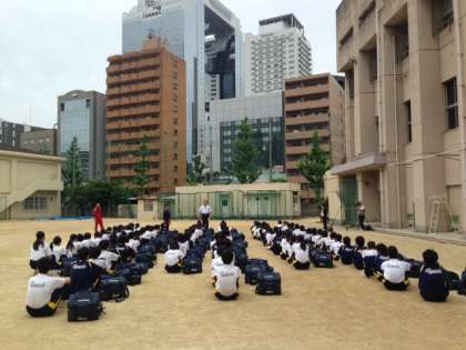 学校で集合、これからバスに乗り、一泊移住に行きます。