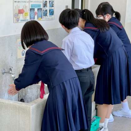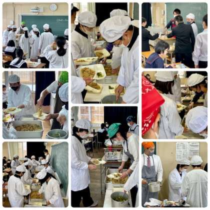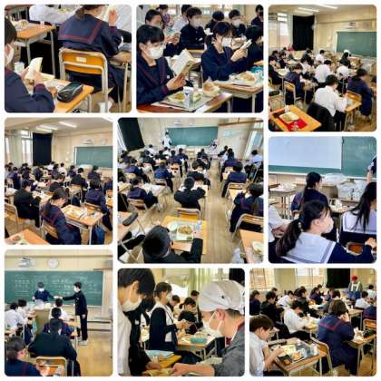 給食の時間です。しっかり手を洗って、給食当番を中心に、みんなで協力して配膳をします。配膳の間も読書をして静かに待っている生徒もいます。配膳が済んだら「いただきます」給食のはじまりです。