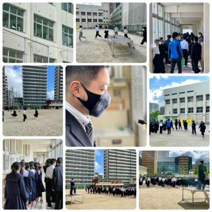 午前9時、教頭先生の校内放送で避難の指示が放送されました。生徒の皆さんは整然と素早く運動場に避難完了しました。特に3年生は4階に教室があるにも関わらず2分程度で全員の避難が完了しました。さすが最上級生です。避難完了後、校長先生、北消防署の方から講評をいただきました。