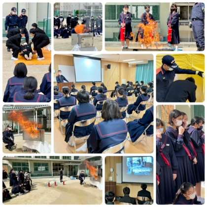 次に学年別防災訓練に写りました。1年生は「A 防災ビデオ映像を通して」地震、津波、火災などの基礎知識を学びました。「B 煙トンネル体験」実際にグランドで、1人ずつ火災時の煙を体験しました。トンネルに入ってみると、前の人が全く見えないことに驚きました。煙トンネルの後は簡易担架を使って友達を運びました。「C 消火体験」最初に、天ぷら油火災の実験をしていただきました。家庭では天ぷら火災が非常に多いそうです。実際に火のついた天ぷら油に水をかけると、爆発と共に大きな火柱があがりびっくりしました。