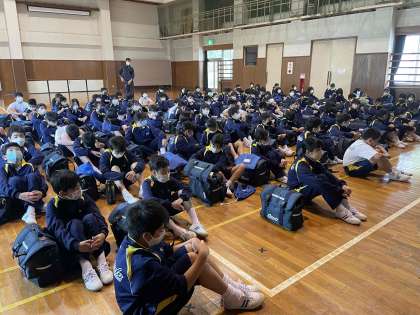 体育館に集合しました。このあと、薪割りとピザづくりです。