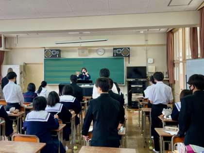 2年2組音楽の様子です。混声2部合唱「夢の世界を」を練習していました。窓を開けて換気をしてマスクをつけて歌っています。