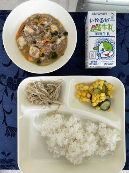 マーボーどうふ、きゅうりとコーンの甘酢あえ、もやしとピーマンのごまいため、牛乳、ご飯です。
