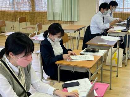 教育実習に来ている先輩たちです。今日で4日目となりました。参観授業のない時間は、しっかりと教材研究に取り組んでいます。