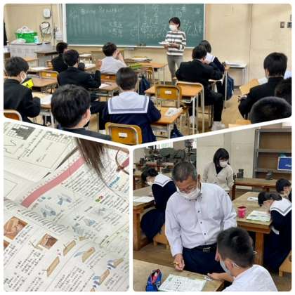 1年3組は英語の学習です。田中先生、山本先生の丁寧な授業です。1年2組は少人数制で技術と家庭の学習です。