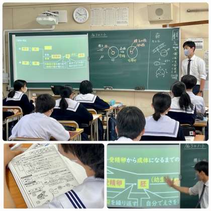3年2組の理科の授業の様子です。受精卵が成体になるまでの学習です。高原先生は自作のパワーポイントを作って、とてもわかりやすい授業をしてくださいます。
