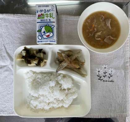 きびなごのてんぷら、豚汁、わかたけ煮、ご飯、牛乳です。