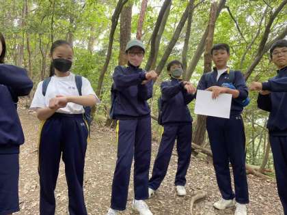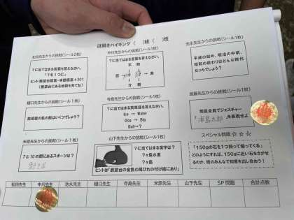 謎解きが正解でシールがもらえます。ポイントに立っている先生の問題に謎解きをしながら、ハイキングコースを探検しています。